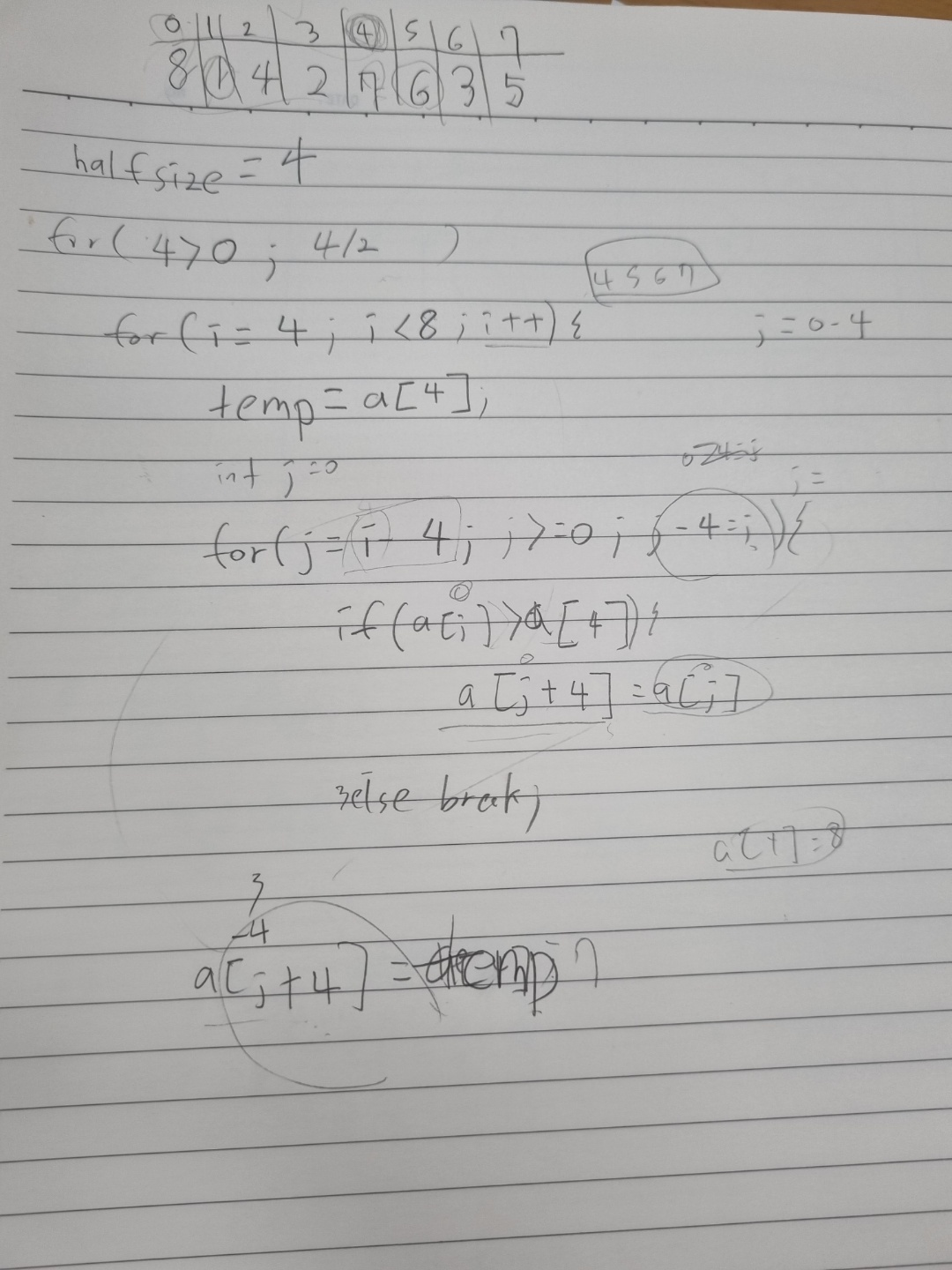 for(j=i-halfSize;j>=0;j=j-halfSize) {// 그룹끼리 비교하기 위해