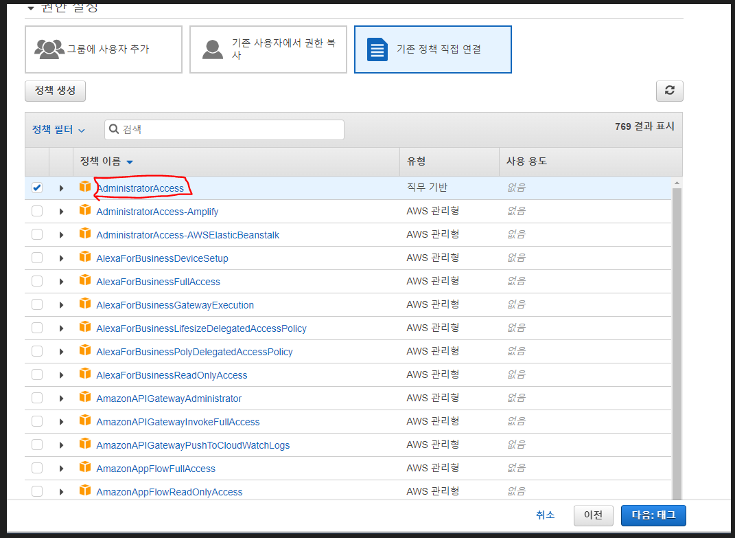 • AdministratorAccess 권한( aws 모든 권한 부여 단, 빌링 제외) 클릭